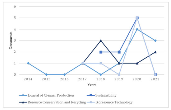 Even if the Journal of Cleaner production is the source where most of the papers were published in the temporary arc considered, it is not the most active in absolute terms: Figure 4 shows the trend of publication over the years in different journals (namely, the first four on the list with more than seven articles). Sustainability and Bioresource Technology published more (five documents each) in 2020 than the Journal of Cleaner Production (four documents).