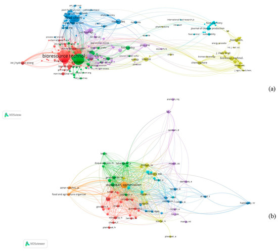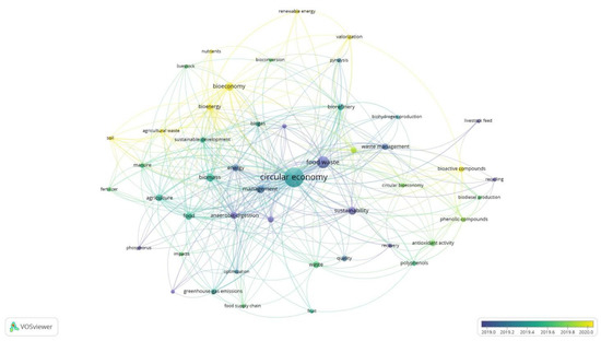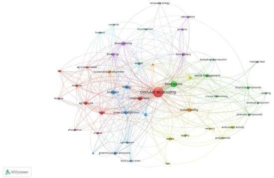 The node of the network is represented by “circular economy”. Considering all keywords, the items (objects belonging to the network) with more occurrences, beyond “circular economy” (74) and “food waste” (27), are “biomass” (13), “sustainability” (13), “food” (10), “agriculture” (9), anaerobic-digestion” (9), “bioenergy” (7) and “life-cycle assessment” (7). This shows that the concept of the circular economy in the agri-food sector is strictly connected with the sustainable development of the industry and the environmental aspect. The renewable energy generation and energy from scraps and wastes remain the main areas of research, while the recovery of bioactive compounds from food industry by-products is not fully investigated by the scientific community.
