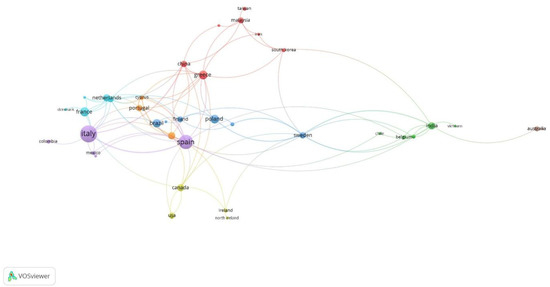 Figure 7 shows the network visualisation map for the co-authorship, related to the number of documents of a country. In this representation, the dimension of the circle represents the number of documents produced, and the closeness between labels represents the relatedness for the number of co-authored documents. The countries that have published at least one document were considered. A total of 49 countries were identified. The results showed in the figures represent only the networked items.