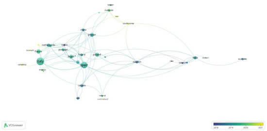 Figure 8 shows the Overlay visualisation of the countries’ co-authorship network. In this representation, the score of the item is represented by the average publication year of the documents. The darker colours (blue) represent the first to be published. A brighter colour (greenish, yellow) means that the country started to publish later.