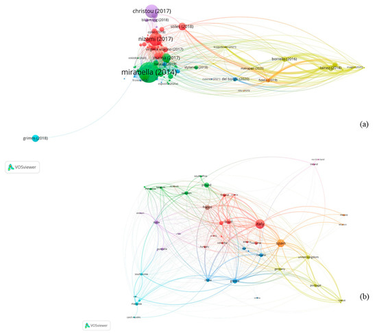 Figure 10 shows the results for the bibliographic coupling for documents (a) and countries (b). Bibliographic coupling takes place when two publications refer to a common third work in their references and they both cite the same document. It is useful to pull out the fact that the two publications may concern a related topic. The dimension of the circle represents the number of citations for the first network and the number of documents for the other. Documents with at least one citation were considered, and countries with at least one document were included. The results showed in the figures represent only the networked items.