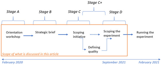 Codesign activities engaged the different panels in a series of activities to orient the work (Stage A), develop a strategy (Stage B), scope the initiative (Stage C), scope an experiment to test the initiative (Stage D), and finally to run the experiment. An additional stage was added, Stage C+, which was initiated following a Stage C decision to further investigate the definition of ‘quality’ (see Figure 4). Stages A to D are discussed in this article.