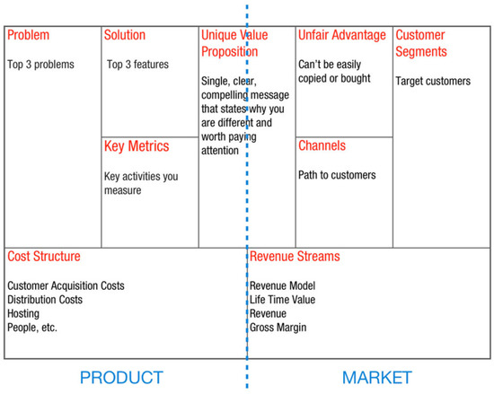 The third collaborative activity (Stage C) was organised online using Mural, a digital platform for visual collaboration. A lean canvas, one-page business plan, shown in Figure 5 [81], was used to support the session facilitation. Based on the original business canvas developed by Osterwalder [82], the lean canvas is a fast, concise, and effective tool to quickly flesh out new product and service ideas while identifying the best idea and validating it.