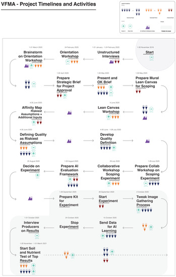 The case study was initially planned to run over a period of between three and six months, but this was extended to seven months due to the COVID-19 pandemic that impacted the sites between February and September in 2020. The general approach to the project was transdisciplinary and participatory. This provided the guiding principles to engage with AI within a complex system environment, with humans at the centre and informed by multilevel perspectives. The exploratory case study built gradual common knowledge about the subject and its relation to participants in a bottom-up driven process. This was done by selecting three groups of participants from different disciplines and backgrounds who would inform and guide the process (Section 2.1). These groups are a crucial element when working with AI [13] to ensure that a diversity of at times opposing views are represented in the analysis [28]. Iterative and codesign approaches supported the problem definition and solution development (Section 2.2). The transdisciplinary co-creation framework [67] (p. 191) is useful in supporting the development of balanced AI scenarios (across social, technical, and environmental realms) [45,68]. A sustainability and ethics validation framework anchored intent and goals of the VFMA’s project (Section 2.3). The viewpoint from which we conducted the case study—design and systems thinking—allowed us to see solutions within a whole-system context, which then allowed us to better identify the social and environmental costs of AI and their trade-offs with the benefits of AI [4,13,26]. The results were then analysed to reveal the elements in the case study, which could be reproduced for similar research (Section 2.4).
