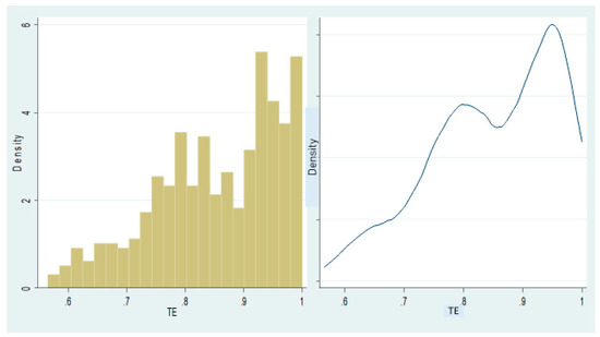 The results in Table 3 show that 14 percent of the smallholder farmers have an overall TE of 1.000 (100 percent), with the assumption of CRS. It was also interesting that only around two percent of the total sample farmers fall under the lowest efficiency group—less than 60 percent. This indicates that 84 percent of the sample farms have overall TE scores between 0.61 and 1.00 with respect to use of inputs in groundnut production. The findings further show that overall TE scores ranged between 0.58 and 1.00, with a mean score of 0.79, implying that the sampled groundnut farms could still produce the same level of output, even by reducing 21 percent of the current level of input usage [21,22,23]. As shown in Figure 1, the distribution of overall TE scores is tilted towards the right side, implying a higher level of overall TE in groundnut production, with a mean score of 0.79. The Pure TE scores ranged between 0.59 and 1.000, with a mean score of 0.86, and scale efficiency scores ranged between 0.638 and 1.000, with a mean efficiency score of 0.93. These findings indicate the following: