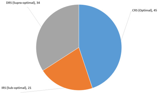 Around 45 percent of the sampled groundnut farmers are operating at optimal scale (CRS) conditions (Table 4 and Figure 3). However, 21 percent of the farmers are operating at sub-optimal scale (IRS) conditions, and the remaining 34 percent of the farmers are operating at supra-optimal scale (DRS) conditions. The results of the distribution of farmers across IRS and DRS operations in the production frontier revealed that 21 percent of them had the scope to increase the scale size and 34 percent had the scope to reduce the scale size, so as to improve their resource use efficiency [21]. However, a higher mean scale efficiency (0.932) implies that the inefficiency across IRS and DRS farms was mainly because of improper scale size.