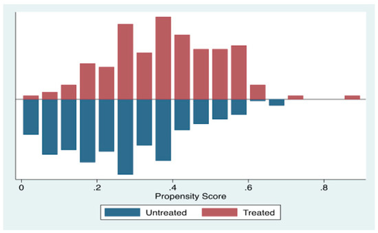 Low Pseudo-R2 and the insignificant likelihood ratio tests have proven that both groups have the same distribution in the outcome variables after matching (Table 9). Further, the mean absolute bias after matching is found to be less than 20 percent, and this also proved that the matching procedure balanced the characteristics, in both the treated and the untreated groups, and the same was shown through a common support graph (Figure 4). As the outcome variable, TE still remained significant at different levels of gamma; the Rosenbaum sensitivity test (Table 10) revealed that the estimated TEs are robust to unobserved characteristics [19,20,25].