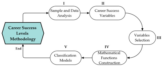 This study contemplates a rigorous six-phase process (see Figure 2), which allows establishing the objective and subjective career success: (i) sample and data analysis; (ii) career success variables; (iii) variables selection; (iv) mathematical functions construction; and (v) classification models.