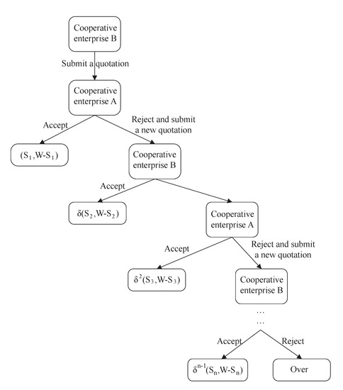 An infinite round bargaining game model is formulated here to simulate the real negotiation scene. It is assumed that at the nth round in the negotiation process, the proposed income allocation method is (S, W − S), the income allocation of cooperative enterprise A is S, the income allocation of cooperative enterprise B is W − S, then the negotiation scene of income allocation can be summarized as Figure 2.
