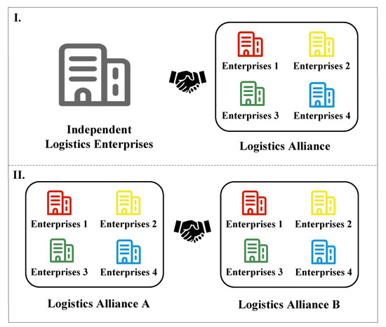 In order to optimize the allocation of logistics resources, reduce the waste of logistics resources, reduce logistics costs and improve logistics benefits, Wang [9] proposed the concept of sharing logistics. Many studies have pointed out that sharing logistics is beneficial to enhance the interests of cooperation entities. Qin et al. [10] proposed that the advantages of shared service strategies continue to increase with the increase of logistics service levels and market potential. When the logistics service level or market potential increases to a certain level, it will lead to a win–win situation. He et al. [11] proposed that if the price is within a certain range, two companies can improve Pareto through logistics service sharing (LSS). When the price of shared logistics services is below a threshold, the social welfare with LSS will be greater than the social welfare without LSS. In addition, sharing logistics has been applied in many real scenes, which has strong practical significance and reference value. Stephanus [12] studied the application of sharing logistics of resource interoperability in Singapore. Wang et al. [13] took Chongqing as an example to prove the effectiveness of the collaborative mechanism and optimization algorithm of sharing logistics. In addition, Marcucci et al. [14] took Rome’s limited traffic zone as an example, and combined the discrete choice model with the agent-based model, considering the heterogeneous preferences and interaction effects of stakeholders, which better supported the real participatory decision-making process of freight related policies, through building consensus and minimizing the efficiency loss caused by the negotiation process.