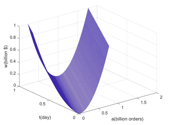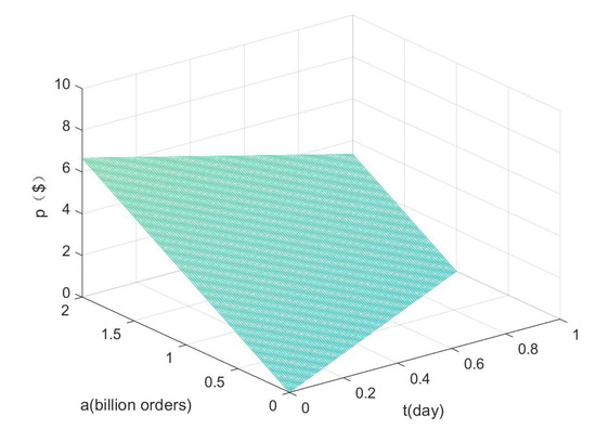It can be seen that the change of the values of a and t will affect the optimal value of freight, where p and a are directly proportional with a proportional coefficient of 3.33. p and t are directly proportional with a proportional coefficient of −3.33. The influence of a and t on p is shown in Figure 11. In the actual application scene, the market a is around billion orders, t is about 0.6 days, p is about USD 1.5. Therefore, the base value of a in this sensitivity analysis is billion orders, the base value of a is 0.6 days.
