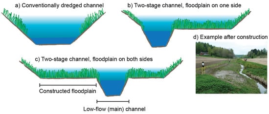 Two-stage channel (TSC) design has been proposed as an alternative to conventional dredging to mitigate the adverse environmental impacts of drainage (e.g., [12,13]). Two-stage (compound) channels consist of constructed floodplains on one or both sides of the existing main (low-flow) channel (Figure 1b–d). TSCs are a nature-based solution since their design mimics the natural geometry of lowland streams that have a rather small main channel with adjacent frequently flooded floodplains. The TSC design aims at optimising the transport of both water and sediment [14] and thus at lengthening the life cycle of the channel by decreasing the required frequency of maintenance (e.g., [15]). The more natural-like geometry and flow conditions in the low-flow channel together with the new floodplain habitat are expected to contribute to enhanced ecological functioning and increased biodiversity, but studies on these aspects are very limited [16,17], while TSCs have been investigated predominantly from the viewpoints of urban flood management and morphological stability (e.g., [18,19,20]). Scientific research on the suspended sediment (SS) and nutrient retention in agricultural TSCs mainly covers Northern American conditions (e.g., [21,22]), with the exception of medium-term studies at one Finnish site (e.g., [23,24]) and a recent study at a Swedish site [25]. To our knowledge, agricultural TSCs have not been holistically reviewed, with previous studies largely neglecting the governance, financing, capacity, and farmers’ acceptance aspects particularly in the European context [22,26]. Cost-benefit evaluations of TSCs [27] are needed to understand whether the benefits outweigh the reported higher construction costs compared to conventional dredging (e.g., [7,15]).