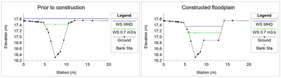 The TSC design was based on excavating a floodplain on one side of the channel at the estimated water level corresponding to annual mean discharge. In meandering reaches, the floodplain was constructed on the inner bends. The opposite bank was left intact, except for removing some large bushes. The bed and banks of the low-flow channel were not excavated, while excessive woody debris was removed from the channel bed to reduce the flow resistance. The site has been intensively investigated since the summer before the floodplain excavation (e.g., [13,23]).