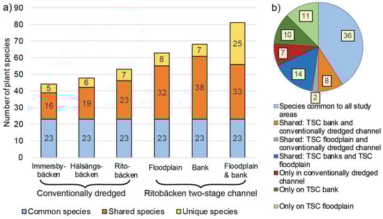 (a) Number of plant species in the three conventionally dredged channels and the Ritobäcken TSC. Common: Species found in all channels; shared: Species found in two to four channels; unique: Species found in one channel. (b) Number of species on the TSC banks and floodplain and in the conventionally dredged channel of Ritobäcken.