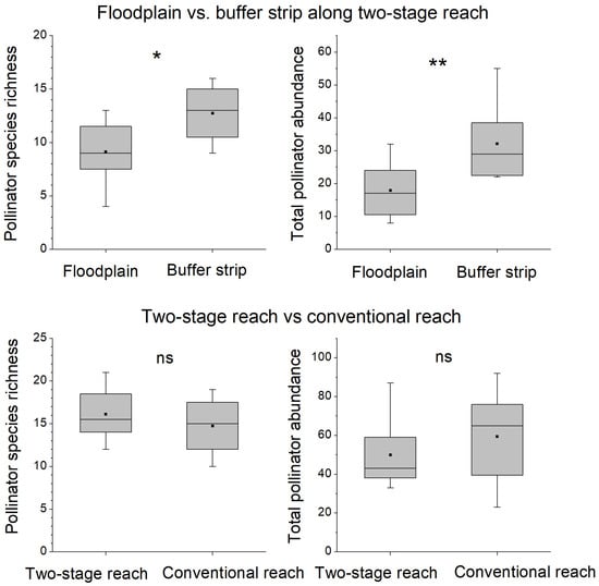 Comparison of total pollinator species richness and total abundance between the floodplain and the buffer strip along the TSC (upper panels) and between the TSC and conventional dredging (lower panels). The boxes show median and first and third quartile values. Means are indicated by small black dots, and minimum and maximum observed values by error bars. * p < 0.05, ** p < 0.01, ns p > 0.05.