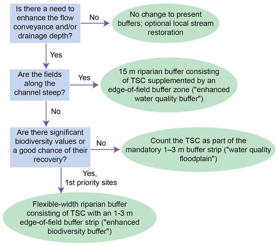 Based on the available studies, agricultural TSCs appeared more beneficial than conventional dredging regarding water quality, stream and riparian biodiversity, and long-term maintenance of the drainage and flood mitigation functions (Table 3; Figure 5). While farmers profit from the well-functioning drainage and flood mitigation through improved crop yields, the environmental benefits are enjoyed collectively at local, regional, and national scales depending on the extent of implementation of the TSC design. The retention and removal of suspended sediment, phosphorus, and nitrogen (e.g., Section 3.1 and Section 3.2.2) improves the water quality both in the channels and in downstream water bodies, benefiting those using these water bodies, e.g., for recreation. The benefits to biodiversity and water quality likely help achieve the local WFD targets. The large-scale application of TSCs could contribute to complying with the national and international agreements on reduction of nutrient loading to the Baltic Sea, such as the Baltic Sea Action Plan of Baltic Marine Environment Protection Commission (HELCOM). While water quality can be best enhanced using a combination of various field- and catchment scale measures, including, e.g., constructed wetlands, improving the stream biodiversity and drainage typically require measures targeting the channel network itself.