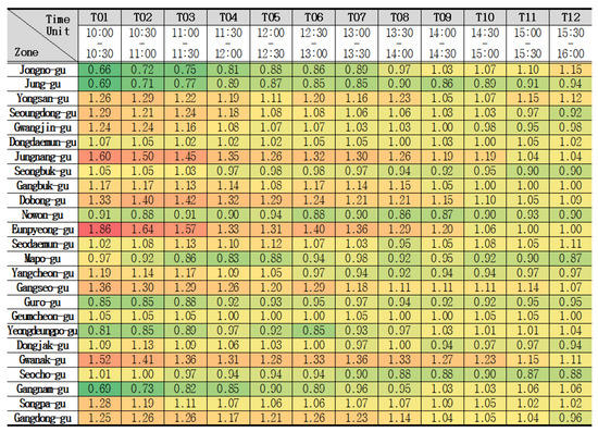 Figure 3. The Gu nodes, such as Jungnang-Gu, Eunpyeong-Gu, and Gwanak-Gu, where residential areas are concentrated, showed high OI Index values from 10 a.m. to 11 a.m. due to lingering demand during the previous morning peak hours. However, it went down over time. On the other hand, Jongno-Gu, Jung-Gu, and Gangnam-Gu are Gu nodes, which have a large amount of arrival due to dense business areas. Namely, it was confirmed that low OI Index values were found at the time adjacent to the peak time in the morning. The OI Index was used to supplement the discount level of the regional fares. The basic fare discount option in the fare bidding system was lowered by 0.1 units from ×1.0 to ×0.6, with a total of five. Also, each basic fare discount level is multiplied by the OI index values by Gu nodes’ time zones. The high-supply Gu nodes have many competitive drivers in the region, so they can offer daring fare discounts. On the other hand, Gu nodes, which are in high demand compared to supply, mean that there are already enough opportunities to pick up customers, so the fare discount will not be high. The discount level of the fares corrected by the OI Index is up to ×0.6 times. The minimum fare discount level was set to ×1.0 times because it was only targeted at discounting fares.