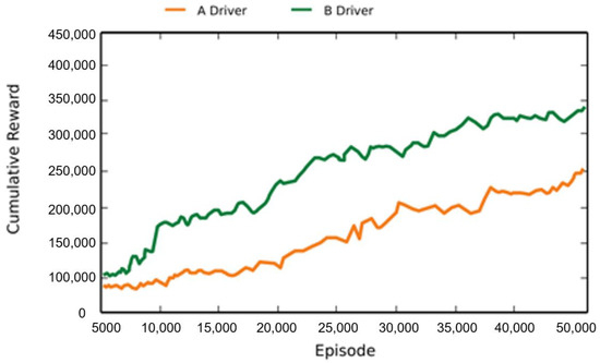 Figure 5 is the average cumulative reward values for driver A and B agents. The average cumulative reward values are the accumulated reward obtained under the agent’s policy, which should be increased as the learning progresses. As a result of comparison of cumulative reward values between agents, when driver B with large waiting time values was compared to driver A, the agent obtained a higher reward value on average.