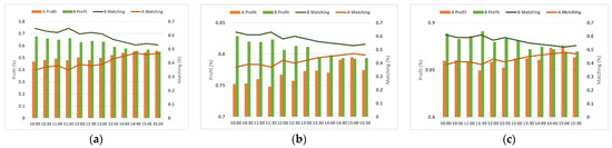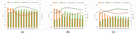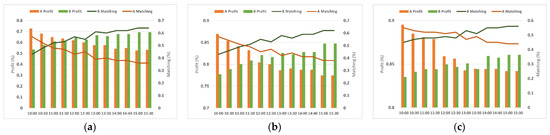 Figure 6). However, it was found that driver B’s profit and matching rate improved as demand-to-supply levels increased over the afternoon. In the morning time zone, driver A’s matching rate was up to 57% on a short distance (a), and the profit rate was up to 89% on a long distance (c). Next, in the afternoon, driver B had a matching rate of up to 64% and a profit rate of up to 86%.