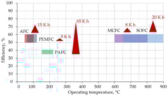 AFC as well as PEMFC refer to low-temperature fuel cells (operating temperature is 50–100 °C) [23]. AFC technologies are the most studied, therefore their power generation efficiency reaches 60% and the service life is estimated at 10,000 to 15,000 h. The main advantages of AFCs are similar to PEMFCs. The disadvantage of AFCs is their high sensitivity to CO2, which reacts with the electrolyte and reduces the efficiency of the fuel cell. CO2 can be contained in the air, so the use of AFCs is limited to closed spaces (space environment, submarines).