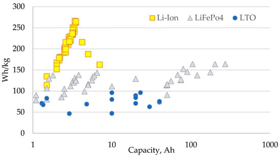 Figure 2 shows the dependence of gravimetric energy density on the capacity value for various types of battery cells.