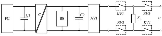 The functional diagram of the developed HFCGS power circuits is shown in Figure 3. The proposed structure provides uninterrupted power supply of the combined resistive and inductive load ZL from the HFCGS or from the AC mains (if available). Switching the power supply from the HFCGS to the centralized electrical network is carried out by high-speed solid-state relays KV1–KV4 controlled by a microcontroller.