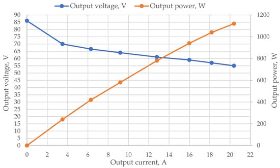 The discharge characteristic of the selected 48 V FC with a power of 1 kW is shown in Figure 4.