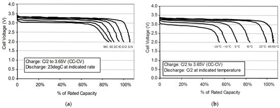 Discharge characteristics of 3.2 V PLB IFR26650-35A batteries: (a) for various values of ranging from 0.5C to 10.0C; (b) when discharged with a constant current of 0.5C at various ambient temperatures.