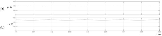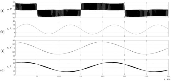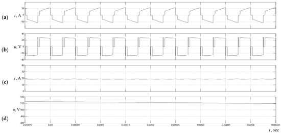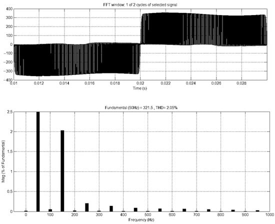 In addition to analyzing the instantaneous values of the current and voltages of the HFCGS’s major components, an analysis of the harmonic components of the autonomous inverter output voltage has been carried out (Figure 12 and Figure 13).