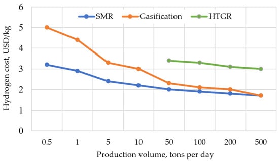 Thus, regardless of the volume of hydrogen production, the cheapest method is the method of steam methane reformation (SMR). The cost of hydrogen starts from 3 USD/kg H2 at low capacities of SMR units, but with a capacity of more than 500 tons per day, it decreases to 1.7 USD/kg H2. Hydrogen production process by coal gasification at low productivity is strongly inferior to SMR, although at high productivity the coal option is practically equal to the SMR method. The method of thermochemical decomposition of water based on HTGR is applicable only at capacities of more than 35–50 tons H2 per day. In this case, the cost of hydrogen turns out to be at least 3 USD/kg H2. The hydrogen production based on electrolysis is significantly inferior in cost indicators to the methods discussed above.
