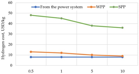 The change in the cost of compressed hydrogen production for various technologies depending on the volume of hydrogen production is shown in Figure 14 and Figure 15 [25,29,30].