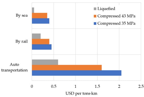 The specific costs of hydrogen transportation is shown in Figure 16. The liquefaction of hydrogen allows for reducing transportation costs by two to five times as compared to the option of compressed hydrogen. Likewise, hydrogen production and the cost of transport will depend on the pace of technology development and cost reduction [31].