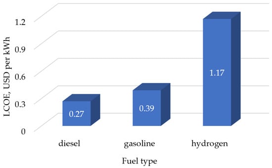 LCOE for diesel, gasoline and hydrogen power plants of the equal capacity.