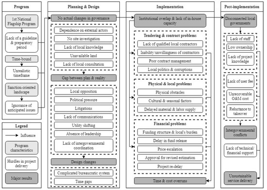 Moreover, institutional overlap hampered the integrity and continuity of work related to different stages of a project. When local governments did not participate in project implementation, they were likely to become reluctant to take over the responsibility for the O+M because their levels of knowledge and ownership related to the project were low (nine respondents). The complicated bureaucratic procedures were originally developed to ensure accountability in project governance. There were many rules and regulations that participating agencies were required to follow, and in some cases, the rules and regulations were not relevant to the context around the project. As a capacity factor at the enabling environment level, the complex procedures combined with a lack of accountability were closely related to the reasons for time and cost overruns (16 respondents).