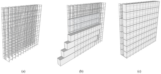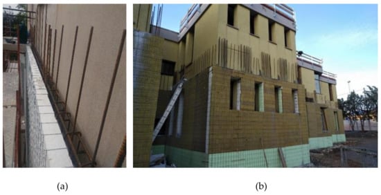 At each floor level, the thickness of the concrete layer is increased to create a perimetral horizontal rib, in direct contact with the masonry or the existing curb, as shown in Figure 2b, in which it is possible to anchor the connectors effectively. The ribs also allow realizing a new reinforced concrete curb in buildings that do not have one. The localized increase in the thickness of the ICF structural layer can be obtained easily by removing a horizontal band of the inner insulating layer. In the same way, vertical ribs can be created, improving out-of-plane stiffness and guaranteeing an effective anchoring to the existing walls or columns. Figure 3 shows the ICF technology with horizontal ribs applied to different structural types.