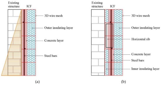 Concrete layer cast within the insulated formwork. (a) Application to a masonry building; (b) application to an RC frame; (c) detail of the ICF concrete layer.