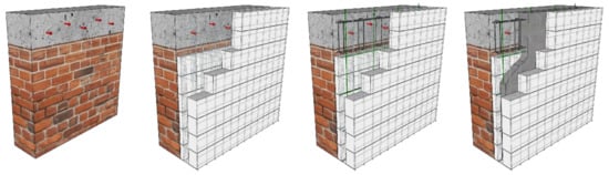 The ICF retrofitting technology is conceived to be applied to a wide range of building typologies, due to the possibility of producing and assembling the formwork panels of any geometry directly in the factory. The installation can be performed quickly and easily, given the lightweight of the ICF panels that facilitates their handling and installation. The main phases of the integrated retrofitting intervention with the proposed ICF technology are illustrated in Figure 5.