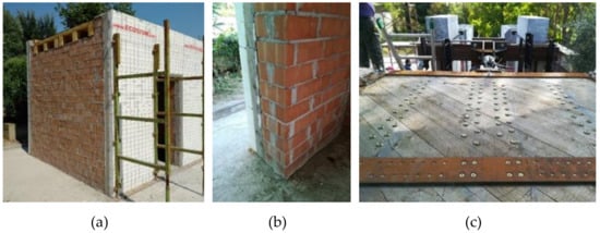 The building has a rectangular plan with dimensions 3.2 × 3.0 m and a height of 3 m, and it was made of multi-hole clay bricks. The longer walls, parallel to the applied horizontal load, had a centered door opening (1 m long and 2.1 m high). The roof consisted of a wooden floor with timber beams aligned with the longer side of the building, one layer of planks perpendicular to the beams, and a second stiffening layer positioned at 45°. The floor was connected to the walls by means of steel plates of class S355 and section 140 × 14 mm (longer side direction) or 160 × 14 mm (shorter side direction), as shown in Figure 9d. The steel plates parallel to the longer side were connected directly to the timber beams with 12 × 160 mm self-tapping partially threaded screws through the two layers of timber boards.