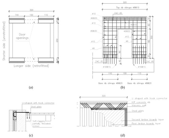 In the direction parallel to the longer plan side, the walls were strengthened with the ICF retrofit technology. The minimum possible thickness of concrete layers was adopted, together with the minimum amount and optimum location of the steel reinforcement. The final wall section, starting from the inner toward the outer of the building, was composed of 250 mm brick masonry, a 40 mm EPS insulating layer, a 60 mm RC structural layer, and a 100 mm EPS insulating layer. The total thickness of the retrofitted walls was 450 mm. The inner insulating layer was present for all the wall height except 300 mm before reaching the ground and floor levels in order to create two horizontal ribs with a cross-section of 100 × 300 mm. Details of reinforcement are illustrated in Figure 9b. The ribs were reinforced with four Ø6 mm longitudinal rebars and with Ø8 mm stirrups, with a spacing of 300 mm. The concrete layer was reinforced with Ø6 mm vertical and horizontal rebars, with a spacing of 300 × 300 mm, while Ø10mm rebars were placed around the door opening, on top and bottom of the RC spandrel, and at the ends of the walls. The connection of the strengthening concrete layer to the foundation slab was made using Ø16 mm dowel rebars with a spacing of 150 mm and a height above ground of 900 mm. The concrete class used for the structural layer was C25/30, and the rebars were class B450C, according to Italian standard NTC18 [51]. The nearly rigid timber floor is connected to the ICF concrete layers through hook-shaped Ø14 mm B450C steel rebars, as shown in Figure 9c. The hooks are embedded in the horizontal top ribs of the ICF, while on the other end, they are welded to steel plates parallel to the longer plan side, which are fixed to the timber floor. Eight Ø14 mm rebars were placed on each side of the building parallel to the longer plan side, with a 45° inclination with respect to the load direction, as shown in Figure 9d.
