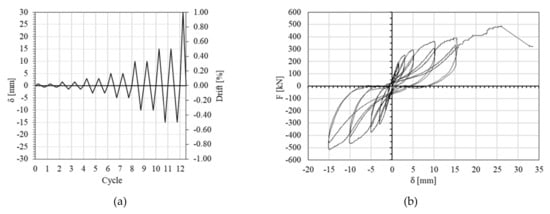 Experimental test on the single-story masonry building (adapted and modified from Pertile et al. [49]): (a) displacement history imposed at the top of RC walls; (b) experimental load–displacement curve for displacement δ measures at the top of the RC walls.