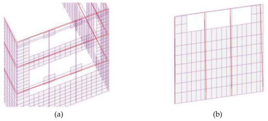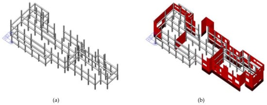 Numerical model of block C1+C2: (a) existing structure; (b) retrofitted structure (adapted and modified from Pertile et al. [49]).