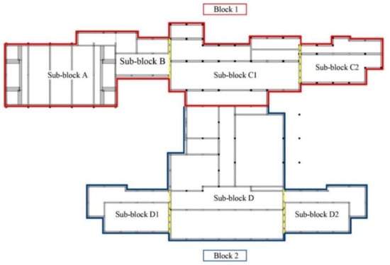 Vulnerability assessment of the existing structures showed poor seismic performance, highlighting the need for a strengthening intervention. The retrofitting of Block 2 was performed with traditional steel braces technology to reduce the displacement demand on existing frame structures. Details of this intervention are not discussed in this work. In Block 1, for sub-blocks A, C1, and C2, the ICF retrofitting technology presented in this work was applied. For the sake of brevity, in the following, only the design for sub-blocks C1 and C2 is reported.