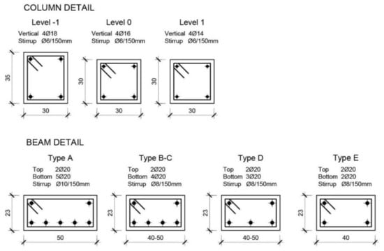 The typical section of the columns is 30 × 35 cm at the basement and 30 × 30 cm at the upper levels. All the columns are continuous from the foundation to the roof. The section of the beams is 50 × 23 cm for the internal frame and 40 × 23 cm for the external frames. Geometry and reinforcement details of columns and beams are shown in Figure 19. The RC and hollow tiles mixed floors have 200 + 30 mm thickness, with a total thickness equal to the height of the beams.