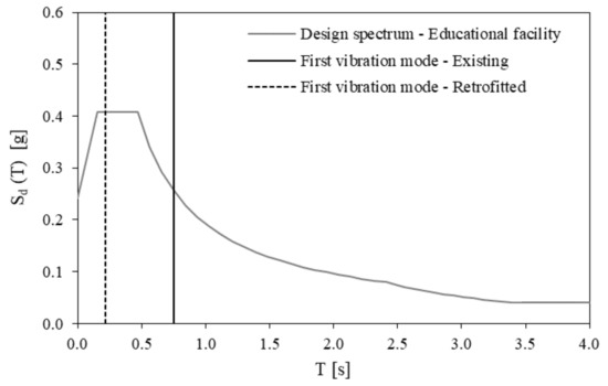 A design inelastic response spectrum was obtained dividing the elastic spectrum ordinates by a factor equal to 1.5, according to Eurocode 8 [48] for non-dissipative structures. Assuming the building fundamental period T1 to belong to the spectrum plateau range (i.e., TB < T1 < TC), the design seismic acceleration Sd(T1) has been evaluated as: