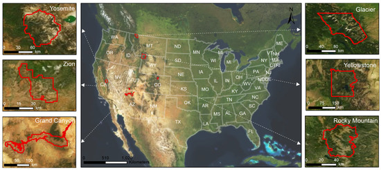 Locations and boundaries of the six national parks examined in this study.