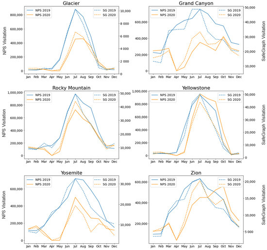 Monthly visitation trends in 2019 (blue lines) and 2020 (gold lines) for six U.S. national parks. Solid lines represent values from the National Park Service Visitor Use Statistics webpage, while dashed lines are values derived from the SafeGraph Social Distancing Metrics dataset.