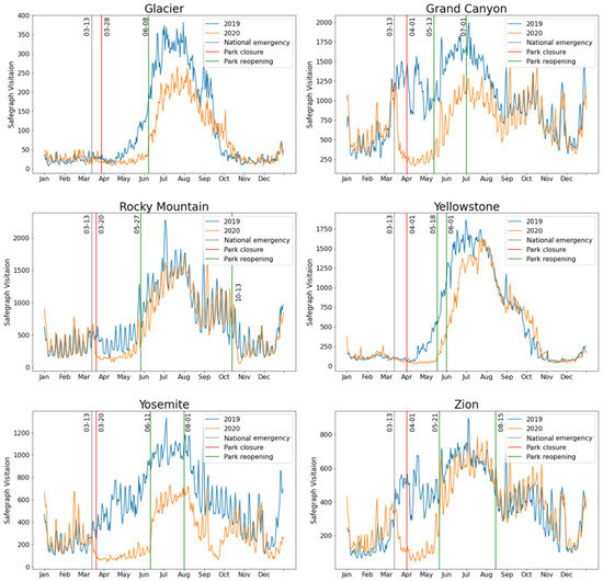 The correspondence between patterns of monthly park visitation based on NPS and SafeGraph data (Figure 2) coupled with the high correlation between the two datasets (Figure 3) suggests that the OD flows extracted from the SafeGraph dataset provided a good approximation of visitation patterns in 2019 and 2020 for the parks examined in this study. However, the SafeGraph data also permitted a more refined examination of the correspondence between park visitation patterns and management actions because of their daily temporal resolution (Figure 4). Note that park closures and reopenings are indicated in Figure 4 by solid red and green vertical lines, respectively; relevant dates for these events are listed in Table 1. The President’s emergency declaration is shown as a gray vertical line on 13 March 2020.