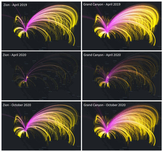 In addition to having the benefit of a daily timestep, the SafeGraph data allowed us to track visitation flows to each individual park over time. Mapping these flows provides a compelling method for visualizing the spatial impacts of COVID-19 on national park visitation, for example, by (1) contrasting the differences in visitor number and origins for April in 2019 and 2020, and (2) demonstrating the effects of park reopening between April and October in 2020 (Figure 5).