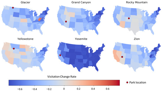 Changes in park visitation between 2019 and 2020 by visitor origin. For each state, change was calculated as: (2020 visitor number–2019 visitor number)/2019 visitor number. The maps were generated using GeoPandas version 0.90.0 with Python.