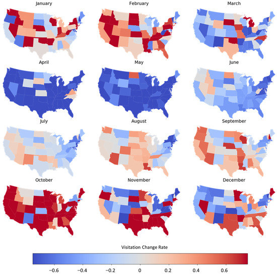 Monthly changes in park visitation at Zion National Park between 2019 and 2020 by visitor origin. For each state, change was calculated as: (2020 visitor number–2019 visitor number)/2019 visitor number. The maps were generated using GeoPandas version 0.90.0 with Python.